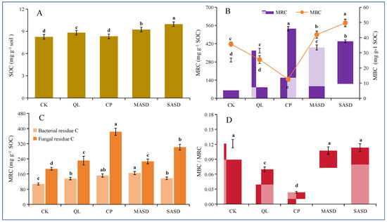 Concentrations of soil organic carbon (SOC) (A), SOC-normalized microbial biomass carbon (MBC), and microbial residue carbon (MRC) (B,C), and the ratio of MBC to MRC (D) under chemical soil disinfestation with quicklime (QL) and chloropicrin (CP), as well as anaerobic soil disinfestation with maize straw (MASD) and soybean straw (SASD). Different lowercase letters denote significant differences (p ≤ 0.05) between soil treatments for each parameter. The values of the histogram are means, while error bars represent standard errors (n = 3).