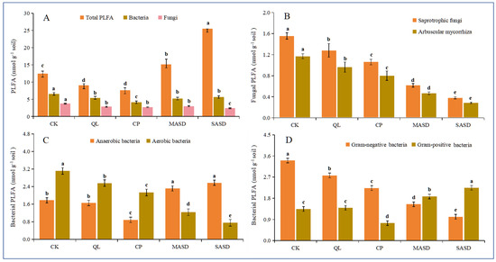 Concentrations of total PLFAs (A), fungal PLFAs (B), and bacterial PLFAs (C,D) under chemical soil disinfestation with quicklime (QL) and chloropicrin (CP), as well as anaerobic soil disinfestation with maize straw (MASD) and soybean straw (SASD). Different lowercase letters denote significant differences between soil treatments for each parameter. The values of the histogram are means, while error bars represent standard errors (n = 3).