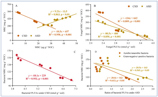 The relationships between soil microbial residue carbon (MRC) and microbial biomass carbon (MBC) (A), fungal MRC and PLFAs (B) under chemical soil disinfestation (CSD) and anaerobic soil disinfestation (ASD); bacterial MRC and PLFAs under CSD (C) and ASD (D).