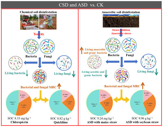 However, the significant depletion of living microbes under CSD has adverse consequences in terms of soil vitality and overall ecosystem service functions, which generates cautionary concern regarding their use in agricultural practices. Therefore, ASD serves as a promising strategy to improve soil health by increasing SOC, controlling soil-borne diseases, and addressing other soil barriers such as acidification, salinization, and heavy metal pollution [8,11]. Given the short duration of ASD practice, long-term evaluation should be conducted to better understand the subsequent fate of MRC in soil.