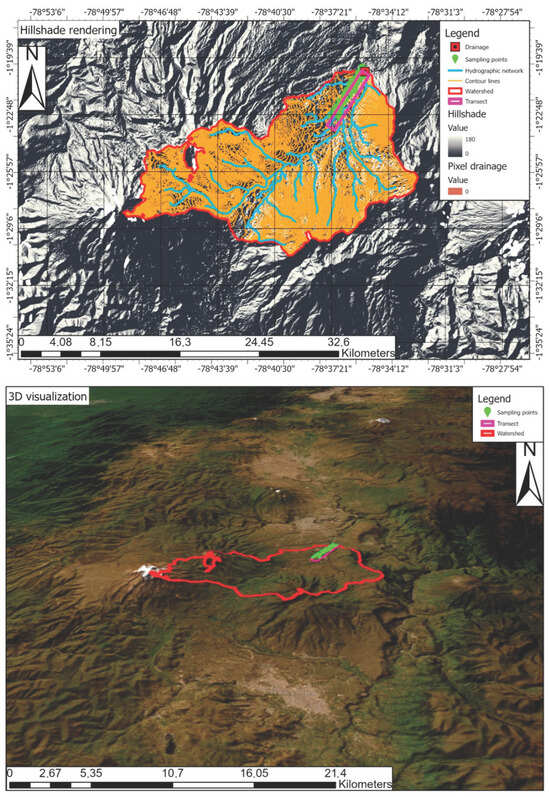 Samples were collected from the Quebrada Jun Jun Watershed along a transect, with the following coordinates: west longitude 78°59′16.50″; south latitude 01°34′32.31″; west longitude 78°61′83.36″ and south latitude 01°38′57.95″ (Figure 2). In the transect, representative sampling points were selected, considering the altitude and vegetation cover of the area. In terms of altitude, three zones were identified: zone 1 (<2800 masl), zone 2 (2800–2900 masl), and zone 3 (>2900 masl). Additionally, to consider the vegetation cover variable, samples were collected in areas both with and without vegetation cover in the three zones.