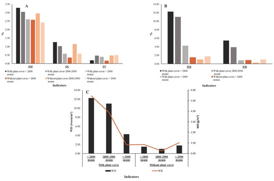 The OC content is the primary indicator of biological and chemical soil quality, and it strongly influences soil’s physical quality indirectly. The OC in the soils with vegetation cover and without vegetation cover presented significant differences with the altitude variable. The results revealed that soils at altitudes below 2800 m above sea level had the highest OC content, at 1.26%; conversely, samples collected from altitudes greater than 2900 m above sea level had the lowest amount of organic carbon, at 0.58% (Figure 1). The organic carbon storage capacity in the soil of high Andean grasslands is influenced by the altitudinal gradient and soil temperature. As the altitude increases, the soil exhibits a higher capacity for organic carbon storage []. Additionally, soil cover (whether with vegetation or plant residues) mitigates water erosion caused by surface runoff, reduces soil compaction, increases organic carbon content, and promotes infiltration rates [].