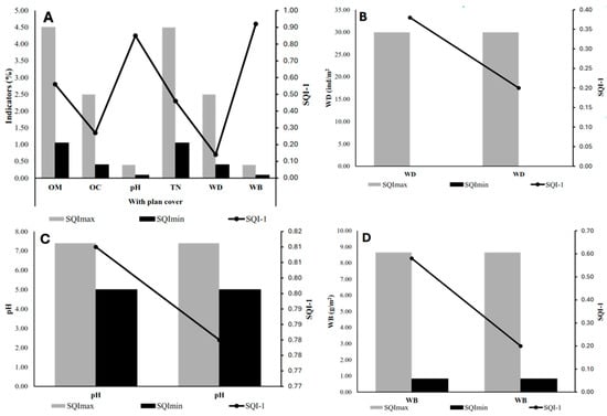Indicators for estimating the soil quality index (SQI) collected under two types of vegetation cover across three altitude categories: (A) Soil quality index of organic carbon (OC), organic matter (OM), and total nitrogen (TN) with vegetation cover and altitude. (B) Soil quality index of the number of earthworms (WD) with vegetation cover and altitude. (C) Soil quality index of pH with cover vegetation and altitude. (D) Soil quality index of earthworm biomass (WB) with vegetation cover and altitude.