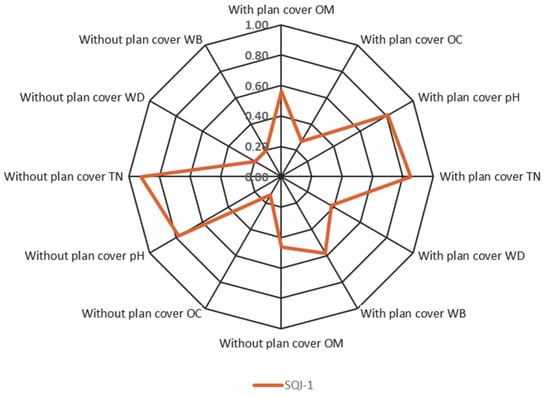 Soils with vegetation cover have an average quality index of 0.58, while soils without vegetation cover have a quality index of 0.45 (Figure 5). These results show that vegetation and soil have a direct and close relationship, as soil and vegetation mutually influence one another over time []. Vegetation contributes to nutrient retention, improves soil structure, and promotes microbial activity—key factors for soil quality []. In this sense, vegetation improves soil structure and water retention, promotes microbial activity, and prevents erosion. Plant roots can contribute to the formation of soil aggregates, improving porosity and nutrient retention capacity []. The drastic decrease in the soil quality index in areas without vegetation cover could be due to the loss of these associated benefits of vegetation. The absence of plants can lead to soil compaction, loss of organic matter, and a decrease in microbial biodiversity, negatively affecting the soil’s ability to sustain plant life []. These findings support the importance of conservation and restoration of vegetation cover as key strategies to improve and maintain soil quality. Additionally, they may have significant implications for land-use management, sustainable agriculture, and mitigating soil degradation. It is crucial to consider these results when designing policies and soil management practices to ensure the long-term health of terrestrial ecosystems.