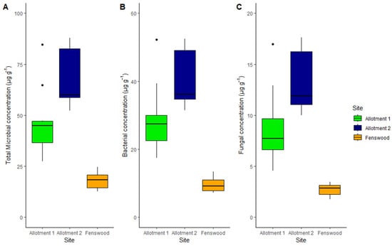 For all three sites, bacterial abundance contributes more to the overall total microbial abundance (59%, mean of all soil samples) than fungal biomass (18%, mean of all soil samples) (see Figure 2B,C). The pairwise differences in allotment 1 and allotment 2 against Fenswood for bacterial biomass are 19.38 µg g−1 and 31.05 µg g−1, respectively, (p < 0.001) and 6.01 µg g−1 and 10.57 µg g−1, respectively, (p < 0.01) for fungal biomass. Therefore, both bacterial and fungal abundance are significantly greater under permaculture managed soils compared to conventionally managed soils. However, fungal abundance does statistically differ between the permaculture practiced allotment soils (p < 0.01), implying fungi varies more than bacteria between the sites.