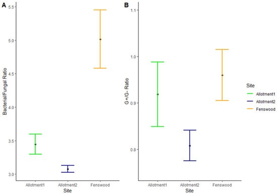 Mean and standard error (n = 10) of (A) bacterial/fungal ratio and (B) G+/G− bacteria ratio. B/F ratio does not statistically vary between allotments (HSD = AAB). G+/G− ratio does not statistically vary between all three sites (HSD = AAA).