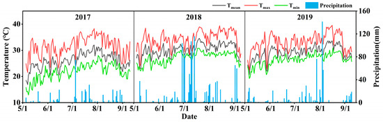 The temperature and precipitation of the experiment site during the maize growing period. Tmax, daily air maximum temperature. Tmin, daily air minimum temperature. Tmean, daily air mean temperature.