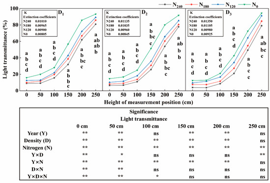 Effects of density and nitrogen rate on population light transmittance and extinction coefficient of summer maize at silking stage (2018–2019 average). D1, D2, and D3, planting densities of 52,500, 67,500, and 82,500 plant/hm2, respectively. Different lowercase letters indicate significant differences among different N rates (p < 0.05). * and **, significant at p < 0.05 and p < 0.01 respectively. ns, not significant.