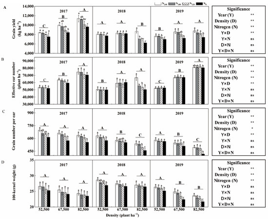Effects of density and nitrogen on grain yield and its components of summer maize in 2017–2019. Grain yield (A), effective ear number (B), grain number per ear (C), and 100-kernel weight (D). Vertical bars represent the mean ± standard error. Different lowercase letters indicate significant differences among different N rates (p < 0.05). Different capital letters indicate significant differences between density treatments (p < 0.05). * and **, significant at p < 0.05 and at p < 0.01 respectively. ns, not significant.
