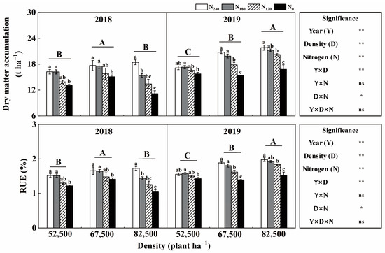 Effects of density and nitrogen rate on dry matter accumulation and RUE of summer maize in 2018–2019. Vertical bars represent the mean ± standard error. Different lowercase letters indicate significant differences among different N rates (p < 0.05). Different capital letters indicate significant differences between density treatments (p < 0.05). * and **, significant at p < 0.05 and p < 0.01. ns, not significant.