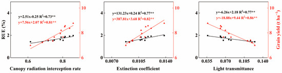Relationship of light transmittance, canopy radiation interception, and extinction coefficient at silking stage with RUE and grain yield (2019). and **, significant at p < 0.01.