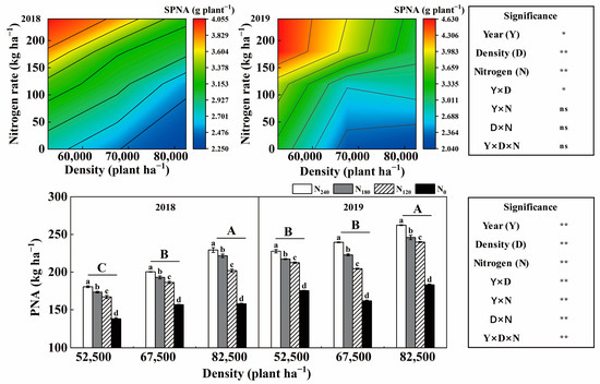 Effect of density and nitrogen rate on single-plant and population nitrogen accumulation of summer maize in 2018–2019. SPNA and PNA, single-plant (g plant−1) and population nitrogen accumulation (kg ha−1), respectively. Vertical bars represent the mean ± standard error. Different lowercase letters indicate significant differences among different N rates (p < 0.05). Different capital letters indicate significant differences between density treatments (p < 0.05). * and **, significant at p < 0.05 and p < 0.01. ns, not significant.