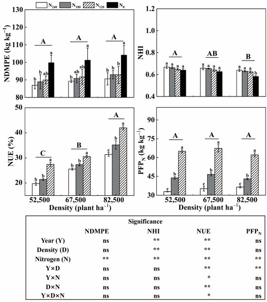 Effect of density and nitrogen rate on nitrogen utilization of summer maize (2018–2019 average). NDMP, nitrogen dry matter production efficiency. NUE, nitrogen fertilizer apparent use efficiency. PFPN, partial fertilizer productivity of nitrogen. NHI, nitrogen harvest index. Vertical bars represent the mean ± standard error. Different lowercase letters indicate significant differences among different N rates (p < 0.05). Different capital letters indicate significant differences between density treatments (p < 0.05). * and **, significant at p < 0.05 and p < 0.01. ns, not significant.