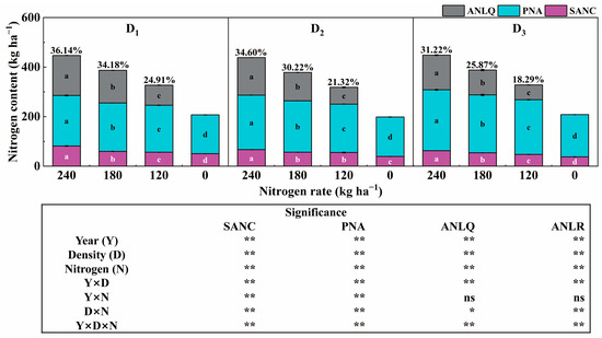 Effects of density and nitrogen on soil nitrogen balance (2018–2019 average). The percent represents soil apparent nitrogen loss rate. Vertical bars represent the mean ± standard error. Different lowercase letters indicate significant differences among different N rates (p < 0.05). Different * and **, significant at p < 0.05 and p < 0.01. ns, not significant.