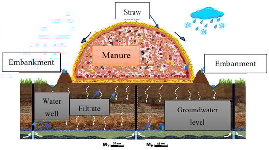 Considering precipitation and air temperature conditions, the risk of groundwater and surface water pollution under and near the stacks always remains. It was determined during the experiment that 189.3 L (190 L can be accepted) of water fell on a 1 m2 stack. It is estimated that during the period of experimental research, water evaporated on average 90–100 L m−2. However, considering the higher than ambient manure temperature, which was recorded during the research, the evaporation from the stack was recalculated and accepted as an average of 110–125 L m−2. Then the final result was obtained in the control stack, which does not comply with the manure storage requirements—70–80 L m−2 of precipitation water filters into or drains from the stack. After evaluating the new stack model installed according to the target requirements, and after covering the stack with a 10 cm thick layer of whole wheat straw, whose estimated absorbency was 2.1 kg kg−1, it is estimated that 10–12 L m−2 of water can be additionally retained and gradually evaporated. Calculate the remaining 60–70 L m−2 of precipitation and the amount of water contained in the thick manure itself (about 40% of the volume) is transformed in the stack in both cases. It can only be removed as manure leachate or surface runoff (Figure 4).