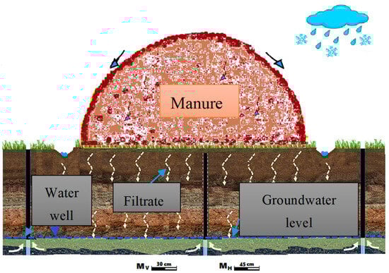 To assess the water quality, wells were drilled around the control stack and around the newly modeled stack, but since the areas were properly located according to all requirements and there was a well-functioning drainage system in the field, water did not accumulate in the test wells. Therefore, a detailed analysis of the absorptions of the soil (target elements), manure, and manure coatings and the substrate (in the case of the new model) was carried out, determining and proving the essential criteria, assessing the interdependencies of long-term environmental meteorological conditions, why the water did not accumulate. Further, considering long-term data and changes in the dynamics of elements absorbed by the soil, the underlying calculations were carried out and forecasting was provided based on meteorological parameters and soil dynamics.