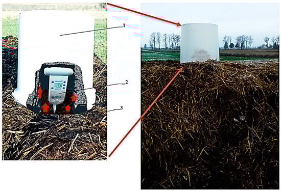 In the manure stack, a sealed chamber with a capacity of 30 L is placed on the surface of the manure, under which the concentration of NH3 gas is measured for 3–5 min (Figure 3). Measurements are made 2–3 times a month in each stack from 5 manure surfaces. NH3 concentration is measured with the analyzer “Aeroqual Series 500”, the measurement limits of which are 0–100 ppm and accuracy < ±0.5 ppm.