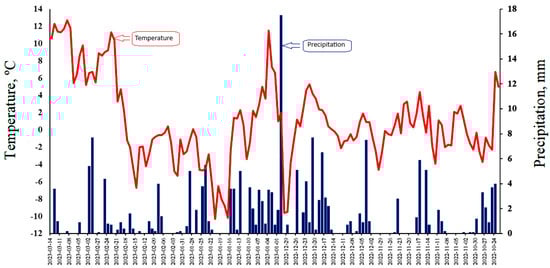 The highest amount of precipitation was recorded on 5 January 2023, with 17.5 mm of rainfall. The average daily air temperature during the entire experiment was +0.9 °C and ranged from −10.3 to +12.7 °C. It was 0.1 °C (10%) higher than the multi-year value for the same period.