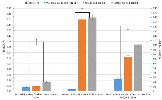 The soil in which the manure storage tests were carried out had a close neutral reaction (pH 6.85–6.95), high P content (221.0–226.0 mg kg−1), medium hardness (139.50–141, 50 mg kg−1), and high humic content in soil (2.36–3.44%); the organic matter was 4.50–4.58%. 6.08–6.33 mg kg−1 of NO3 and NO2, 3.02–3.25 mg kg−1 of NH3, 9.33–9.35 mg kg−1 of mineral, and 0.218–0.268% of total N.