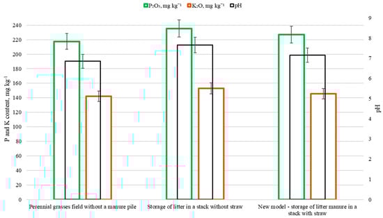 The influence of manure-storage methods on the soil pH index, P, and K content in the soil in the spring after manure storage in stacks in the 0–20 cm soil layer.