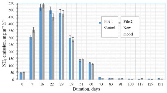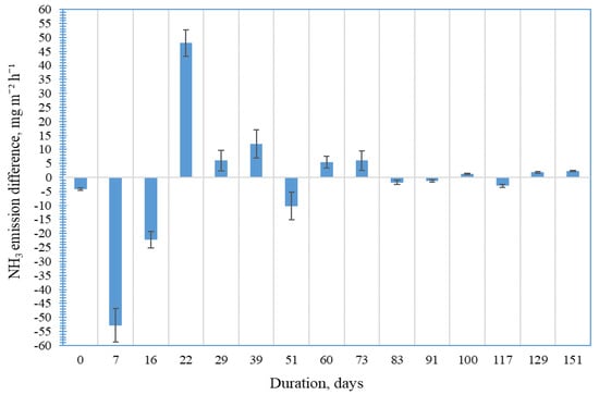 After analyzing the data, it was found that by the 16th day of experimental research, the ammonia emission increased significantly and reached the maximum values during the entire research period—on average up to 550 mg m−2h−1. From day 16, ammonia emissions decreased slightly on average to 470 mg m−2h−1. However, by day 40 of the study, it almost doubled, and from day 73, it increased more than 10 times. Therefore, it is further relevant to analyze how this variation was revealed by evaluating the differences between the control and the new model manure stack.
