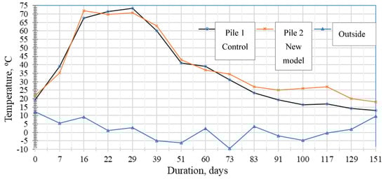 The acidity, moisture content, and composition of manure piled up in stacks do not differ significantly. NH3 emission from manure in both stacks is also similar (Figure 7). The moisture content of the manure is low, which leads to low NH3 emissions: only 50–54 mg m−2h−1. The low acidity, moisture, and favorable C-N ratio of the manure create good conditions for the composting process, which took place intensively in both manure stacks. The temperature of the manure (at a depth of 40 cm in the pile) rose to 49.1 °C in 7 days and reached 73.2 °C in 16 days (Figure 8). The increase in temperature also influenced the intensive NH3 emission from the solid manure: the emission increased from 54 mg m−2h−1 to 545 mg m−2h−1 in 16 days and remained that high for 14 days (Figure 7). The manure in the piles was not mixed and the height of the pile decreased by 21–26 cm within 30 days. Also, the porosity of the manure layer decreased, and less air (oxygen) entered the inner layers of the manure. In the absence of oxygen, the activity of microorganisms slows down, less heat is released, the temperature of the manure drops, and the NH3 evaporation from the manure also slows down. NH3 volatilization intensity decreased significantly after 39 days (to 289 mg m−2h−1) and continued to decrease intensively until it was only 19 mg m−2h−1 on day 73. During the entire research period, NH3 evaporated from the manure piles, very intensively for the first 39 days, then moderately until day 73, and weakly during the last 78 days of the research (on average 6–9 mg m−2h−1).
