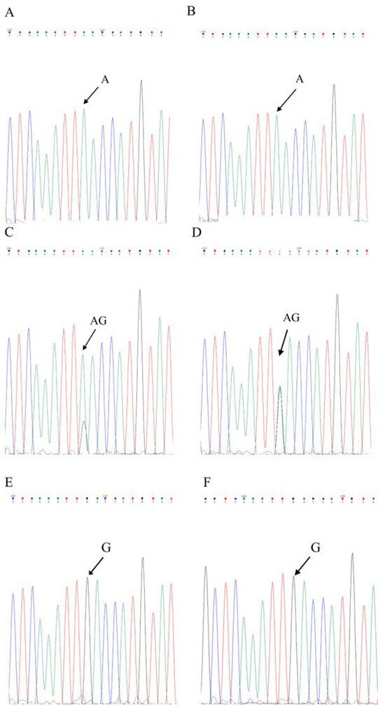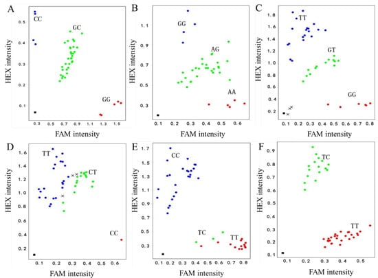 Typing results of some primers. (A) The genotyping of SNP4010, (B) the genotyping of SNP22550, (C) the genotyping of SNP10432, (D) the genotyping of SNP16328, (E) the genotyping of SNP20777, and (F) the genotyping of SNP25886. Note: • represents the genotype of ‘Josapine’, • represents the genotype of ‘MD2’, and • represents the genotype of the F1 generation of the cross.