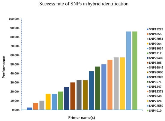 Out of 26 polymorphic SNP markers, only 18 were able to distinguish between 2 parents and 36 hybrids. Notably, SNP4010 and SNP22550 had the highest success rate in distinguishing between parents and hybrids, both at 87.5%. SNP1247, SNP12371, SNP2640, SNP7124, SNP22550, and SNP4010 surpassed a 50% success rate in hybrid identification. Furthermore, SNP12223 and SNP4855 exhibited success rates of less than 10% in identifying hybrids (Figure 3).