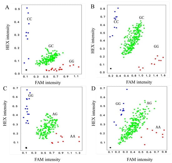 Molecular markers have been successfully applied to the identification of hybrid authenticity and genetic diversity analysis in maize, gourd, mango, rape, and citrus [15,16,17,18,19,20], including random amplified polymorphic DNA (RAPD), amplified fragment length polymorphism (AFLP), restricted fragment length polymorphism (RFLP), simple repeat sequence (SSR), and inter simple sequence repeat (ISSR) [15,16,17,18,19,20]. However, these molecular markers still have shortcomings in terms of stability, polymorphism and automation level of operation and hard to data sharing [21,22,23,24,25]. The single nucleotide polymorphism marker (SNP) is the latest generation of molecular markers, which refers to the DNA sequence polymorphism caused by a single nucleotide variation at the genome level [26]. This technique relies on allele-specific oligonucleotide elongation and fluorescence resonance energy transfer for signal detection [27]. SNP markers have the advantages of high polymorphism, easy detection, good stability, and high throughput, and they are suitable for genome-wide association studies [28,29,30]. They have also been recognized by the International Union for the Protection of New Varieties of Plants (UPOV) BMT Molecular Detection Guidelines as a standard method for determining variety or seed purity.