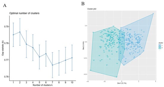 K-means clustering of parental and hybrid offspring genotypes (K = 2). The green color represent Cluster I and the blue color represent cluster II. (A) Optimal number of clusters, (B) K-means cluster plot.