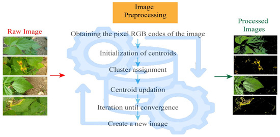 Given that the images were acquired in a natural environment, the initial stage involved the classification of raw images. Subsequently, to enhance the outcomes, the images underwent pre-processing to remove ambient noise. This process, recognized as color clustering, is an image processing technique that aspires to group similar colors within an image into a predetermined number of clusters or groups. Typically, this method accentuates the color structures in the image by categorizing pixels based on criteria related to color similarity. Widely used techniques, such as the K-means algorithm [24], rely on the assignment of pixels to clusters with similar color properties. This process is succinctly described as follows: