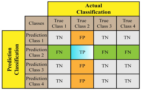 A confusion matrix is a type of matrix that is commonly used to evaluate the performance of classification algorithms. It visually expresses which classes the model predicts correctly or incorrectly, especially in multi-class problems [47]. An example of a four-class confusion matrix is given in Figure 7.