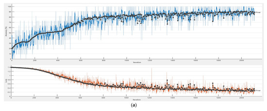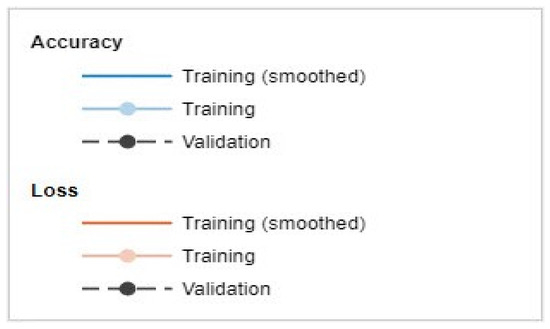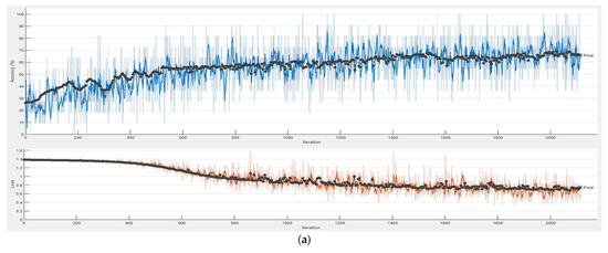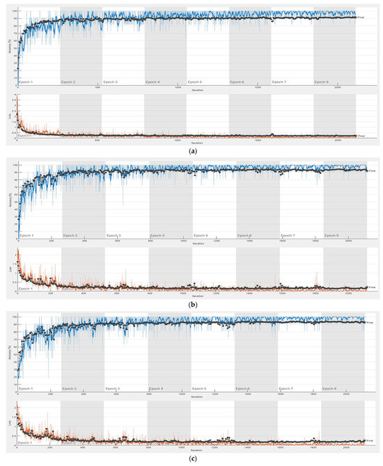 The AlexNet, VGG16, and VGG19 models were hybridized with BiLSTM according to the block diagram given in Figure 18 and the AlexNet+BiLSTM, VGG16+BiLSTM, and VGG19+BiLSTM models were created. The parameters used for the BiLSTM layer were set as follows: input size—automatic; number of hidden units: 100; output mode: last; status activation function: tanh; gate activation function: sigmoid. The raw images in the data were classified by the AlexNet+BiLSTM, VGG16+BiLSTM, and VGG19+BiLSTM hybrid models. The accuracy–loss graphs obtained as a result of these classification processes are given in Figure 19.