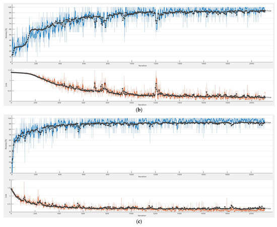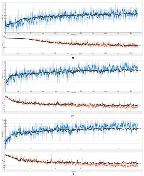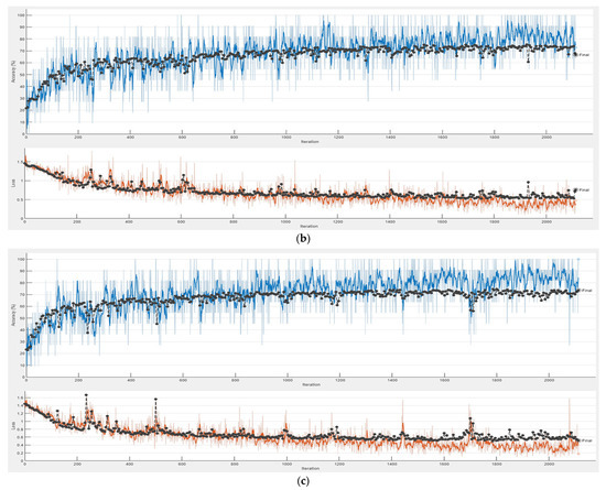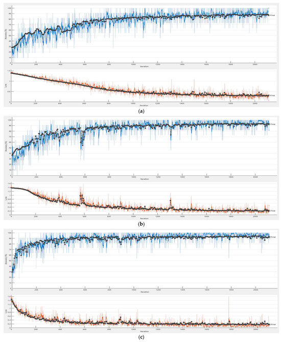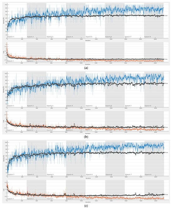 With pre-processed images: (a) AlexNet+BiLSTM accuracy–loss graph; (b) VGG16+BiLSTM accuracy–loss graph; (c) VGG19+BiLSTM accuracy–loss graph.