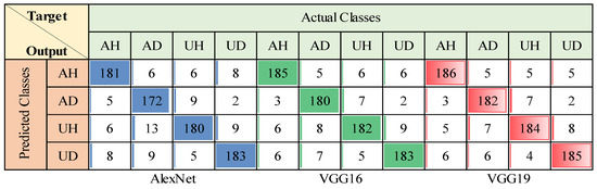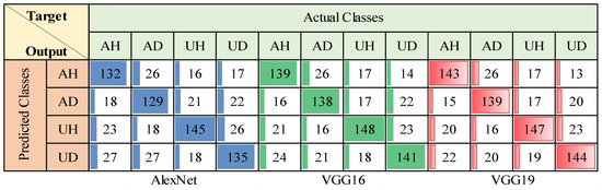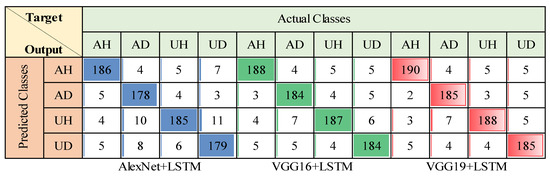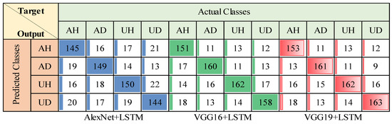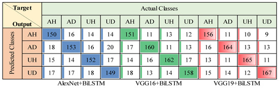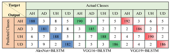 The confusion matrix was obtained as a result of classifying the raw images using the AlexNet+BiLSTM, VGG16+BiLSTM, and VGG19+BiLSTM models.