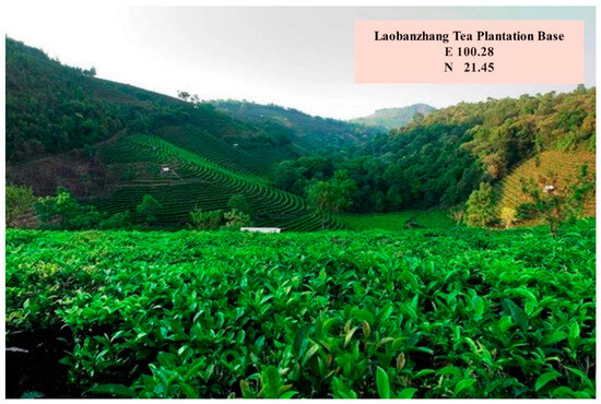 The experimental research was conducted at the No. 1 base of Yuecheng Co., Ltd. (100° E, 21° N), in Xishuangbanna Prefecture, Yunnan Province, China—the birthplace of big-leaf tea. This research focused on the most severe anthracnose disease. The area belongs to the tropical monsoon climate region. The region is located in the southwest monsoon climate zone, with an average daily temperature of 22 °C, a high effective accumulated temperature of 8761 °C, an annual average relative humidity of 79%, an annual average rainfall of 1665 mm, and an annual runoff of 700 mm. The tea garden, where this research took place, is a strip-planted tea garden on a slope. It mainly consists of Mengku large-leaf tea trees that are approximately 10 years old, providing 90% coverage. The region experiences a warm and humid climate throughout the year, with distinct seasons. The dry season occurs from November to February, while the rainy season is from June to August, making it an ideal environment for cultivating various teas. Surrounded by mountains and enveloped in high mountain clouds and mist, the area has rich organic matter in the soil, strong solar radiation, and frequent rainy days, which creates conditions for tea anthracnose to occur year-round. The disease is most prevalent in autumn and poses a significant threat to the genetic diversity of tea varieties. Figure 1 illustrates the tea garden.