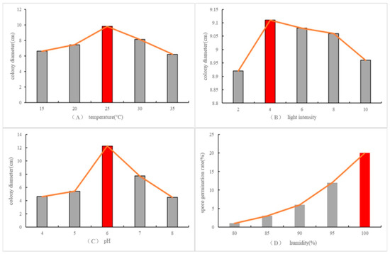 Relevant physical and chemical composition detection experiments were conducted at the Yunnan organic tea industry Intelligent Engineering Research Center. Tea Colletotrichum strain C6 was obtained by isolating single spores from tea Colletotrichum diseased leaves. The strain was then cultured on a slant in a PDA test tube and stored in a 4 °C refrigerator [19,20]. A temperature gradient of 10 °C, 15 °C, 20 °C, 25 °C, 30 °C, and 35 °C was used. Culturing at 25 °C until the mycelium did not cover the Petri dish, hyphae were obtained from the edge of the colony and lines were drawn using the cross method. This process was repeated 5 times for each temperature, and the samples were placed in a 25 °C incubator for cultivation. After 48 h, the diameter of the colony was measured until the Petri dish was full. The pH was adjusted to five gradients (4, 5, 6, 7, and 8) using sterilized KCl-HCl and Na2HPO4-NaOH buffer solutions. The humidity was controlled by the germination rate of spores in distilled water, ranging from 80% to 100%. For soil collection, two points in alternate rows in the tea garden were randomly selected as fixed-point investigation areas. The topsoil (5 cm depth) from the soil surface to the cultivated layer soil within 25 cm was excavated. The altitude and light intensity were set to 5 intensities (2 Lux, 4 Lux, 6 Lux, 8 Lux, and 10 Lux) according to different periods. The experimental results are shown in Figure 2.