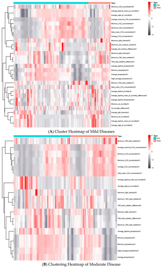 The analysis results in Table 2 indicate that there are 21 environmental factors significantly associated with tea diseases (p < 0.05). These factors include light intensity, humidity, temperature, carbon dioxide concentration, TBQ radiation value, and soil moisture, among others, as discussed in this article. These findings align with the preliminary exploration results presented in Section 2.3. Furthermore, in the single-factor analysis results, it was observed that more than 80% of the environmental factors (p < 0.01) contribute to the worsening of the disease. These environmental factors serve as initial predictors of the disease. Moving forward, we delve into more specific factors that influence disease progression, focusing on environmental factors.
