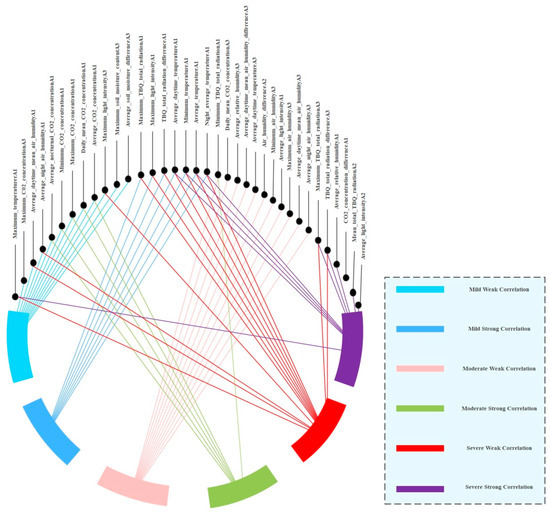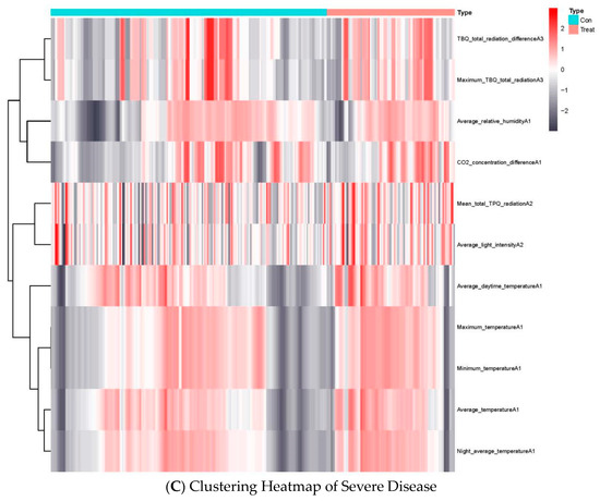 As depicted in Figure 3, the tea anthracnose leaf, which progressed from a mild to severe disease within 7 days after the lesion occurred, was collected. It was observed that various environmental factors, including light intensity, TBQ radiation value, air humidity, carbon dioxide concentration, and soil humidity, exhibited a significant differential expression. During the disease progression cycle, higher concentrations of CO2 were observed, along with a higher daytime air humidity and suitable light intensity. Furthermore, there was a greater difference in TBQ radiation intensity and soil moisture between morning and evening. Research indicates that increased CO2 concentration and high light intensity cause changes in the chlorophyll and oxygen-containing water within the leaves, leading to a slowdown in internal reactions and alterations in the tea cell structure. Additionally, a strong TBQ radiation intensity inhibits the growth of tea anthracnose mycelia and spore germination, with high concentrations causing mycelia and spore distortion. The severity of tea lesions increases with the presence of suitable soil moisture, which facilitates the spread of disease spores. Moreover, the leaves located around the edge of the tea canopy are more susceptible to exposure to tea anthracnose fungi, thereby exacerbating the disease.