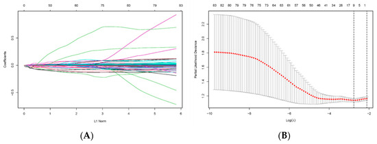 The greater the likelihood function value L β 1 , β 2 , β n , the higher the probability of correct Cox classification and the greater the classification accuracy rate. In this case, there are often more unknown parameters p + 1 . The smaller the AIC value, the better the Cox regression model and the more reasonable the selection of the correct classification probability and complexity. It has been verified that the AIC value of the modeling factor screened by LASSO regression is 2809.033. This is a 24.2% reduction compared to the previous modeling factor with a strong correlation (p < 0.05), which had an AIC of 3705.08.