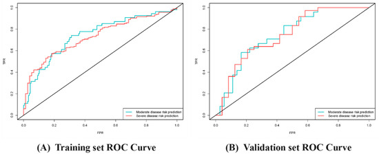The ROC curve of the LASSO-COX-NOMOGRAM prediction model is presented in Figure 7. A higher discrimination of the prediction model is indicated by an ROC curve closer to the upper left corner. To further evaluate the model discrimination quantitatively, this study introduces the AUC (area under the curve) index as a measure of the model’s generalization performance. The AUC value directly reflects the generalization performance of the model, with a larger value indicating stronger generalization performance and discrimination. In statistical analysis, an AUC value greater than 0.7 is considered acceptable. In the LASSO-COX-NOMOGRAM prediction model, when the disease degree changes by more than 30%, the AUC value of the training set is 0.745 and the AUC value of the validation set is 0.75. For the situation where the disease degree changes by more than 60%, the AUC value of the training set is 0.731 and the AUC value of the validation set is 0.747 (Table 5). The results demonstrate that the AUC values of the LASSO-COX-NOMOGRAM prediction model for predicting changes in tea disease degree are all greater than 0.7, indicating good generalization performance and discrimination.