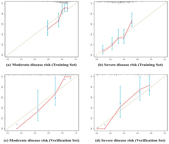 The calibration of a prediction model is a crucial indicator for evaluating the accuracy of a disease risk model in predicting the probability of future occurrence. It directly reflects the consistency between the model’s predicted results and the actual outcomes. In order to assess the calibration, we performed Bootstrap resampling on the training set and validation set 1000 times. Figure 8 illustrates the calibration curves of the LASSO-COX-NOMOGRAM prediction model for changes in lesion extent exceeding 30% and 60%. Among these curves, A1 and B1 represent the calibration curves for changes in lesion extent greater than 30% and 60% in the training set, while A2 and B2 represent the calibration curves for changes in lesion extent greater than 30% and 60% in the validation set. The X-axis in this figure represents the predicted values of the LASSO-COX-NOMOGRAM model, while the Y-axis represents the actual values of the change in the degree of tea anthracnose lesions. The brown dotted line, with a slope of 1, indicates complete consistency between the actual and predicted risk changes. The red solid line represents the actual prediction ability of the LASSO-COX-NOMOGRAM model. The closer these two lines are to each other, the stronger the prediction accuracy. Within a statistical period, the two lines exhibit rough consistency.