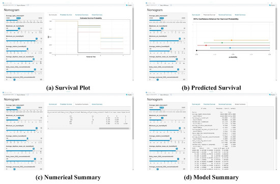 By utilizing nomograms, complex regression equations can be transformed into more intuitive and readable graphics, thereby facilitating the evaluation of factors influencing diseases. To further enhance the ease of conducting risk prediction in real-life scenarios, this study adopts the Shiny framework and employs DynNOM technology to develop a visualization system for the prediction model. As depicted in Figure 9, the visualization system comprises five modules: the input module, Survival Plot, Predicted Survival, Numerical Summary, and Model Summary. The input module primarily handles data import and transformation. The Survival Plot illustrates the risk prediction probability of changes in environmental factors on tea disease levels. The Predicted Survival module presents the predicted comprehensive score for the disease in tabular form, while the Numerical Summary module displays it in numerical form. The Lesion comprehensive score is also showcased. Lastly, the Model Summary module is employed to adjust the modeling parameters of the risk prediction model. Figure 9a is used to visually show the lesion probability of tea anthracnose under different environmental changes. A lighter color means a lower prediction probability; Figure 9c clearly shows the detailed data of each forecast, and the corresponding graphical display is shown in Figure 9b; Figure 9d contains all the parameters for building the prediction model.