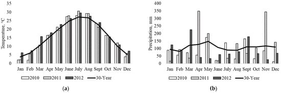 (a) Average monthly temperature and (b) total monthly precipitation near Booneville, AR, for 2010, 2011, 2012, and the 30-year average (1990–2020). Weather obtained from the National Climatic Data Center (NOAA; https://www.ncdc.noaa.gov/cdo-web accessed on 9 May 2024).