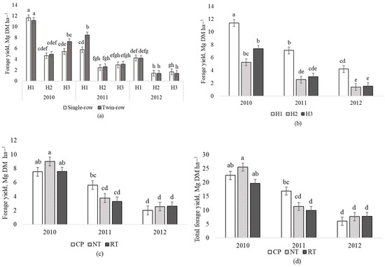 North Location: (a) Dry matter (DM) yields for forage sorghum planted in twin rows and single rows at harvest date 1 (H1), harvest date 2 (H2), and harvest date 3 (H3) for 2010, 2011, and 2012. Effects of row arrangement × harvest date × year. p < 0.01. SEM = 0.53 Mg DM ha−1. (b) Dry matter yields for forage sorghum from H1, H2, and H3 in 2010, 2011, and 2021. Effects of year × harvest date. p < 0.01. SEM = 0.54. (c) Dry matter yields for forage sorghum after chisel plow (CP), no-till (NT), or rototilling in 2010, 2011, and 2012. Tillage × year. p < 0.01. SEM = 0.63. (d) Total forage sorghum DM yields for CP, NT, and RT for 2010, 2011, and 2012. Tillage × Year p < 0.01. SEM = 1.47. Means without a common letter differ (p < 0.05).