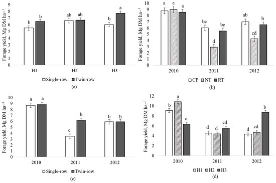 South Location: (a) Dry matter (DM) yields across years for forage sorghum planted in twin-row and single row at harvest date 1 (H1), harvest date 2 (H2), and harvest date 3 (H3). Effects of row arrangement × harvest date. p = 0.03. SEM = 0.32 Mg DM ha−1. (b) Dry matter yields for forage sorghum after chisel plow (CP), no-till (NT), or rototilling in 2010, 2011, and 2012. Tillage × year. p < 0.01. SEM = 0.45. (c) Dry matter yields for forage sorghum planted in twin-row and single row in 2010, 2011, and 2012. Tillage × year. p < 0.01. SEM = 0.37. (d) Dry matter yields for forage sorghum from H1, H2, and H3 in 2010, 2011, and 2021. Effects of year × harvest date. p < 0.01. SEM = 0.40. Means without a common letter differ (p < 0.05).
