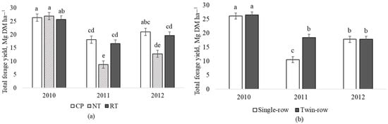 South Location: (a) Total dry matter (DM) yields for forage sorghum planted after chisel plow (CP), no-till (NT), or rototilling (RT) in 2010, 2011, and 2012. Tillage × year. p < 0.01. SEM = 1.35 Mg DM ha−1. (b) Total dry matter (DM) yields for forage sorghum planted in twin-row and single in 2010, 2011, and 2012. Tillage × year. p < 0.01. SEM = 1.12 Mg DM ha−1. Means without a common letter differ (p < 0.05).