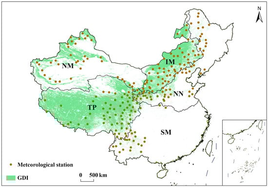 China is located in eastern Asia, bordering the western Pacific Ocean (73°33′ E to 135°05′ E, 3°51′ N to 53°33′ N), and is characterized by a complex and diverse range of climatic types. In order to investigate the spatiotemporal change of grassland degradation in different ecological functional conditions, grasslands in China were divided into five regions according to ecological function. These regions include the Inner Mongolia Plateau grassland region (IM), Northwestern Mountain–Basin grassland region (NM), Qinghai–Tibetan Plateau grassland region (TP), Northeastern and Northern Plain–Mountain–Hill grassland region (NN), and Southern Mountain–Hill grassland region (SM) (Figure 1).