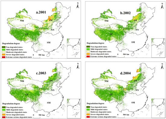 The classification results of grassland degradation in the study regions of China from 2001 to 2019 are shown in Figure 2. It can be observed that during this 19-year period, the spatial distribution of grassland degradation in China’s ecological functional regions exhibited obvious variation. Overall, the grassland degradation in the IM is more pronounced compared to other regions, with most areas experiencing severe degradation. In contrast, other regions are primarily characterized by mild to moderate degradation. This phenomenon became particularly evident in 2005.