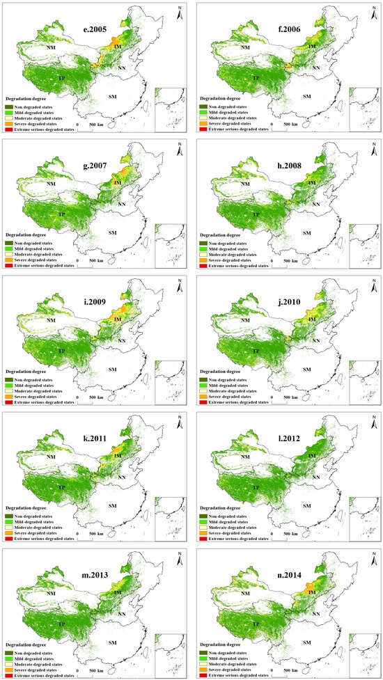 At the national level, the overall grassland degradation situation in China has remained at the level of mild degradation ( = 1.31) over the past 20 years. The comparison between each subgraph in Figure 3 revealed that although the trends of variations differ among the five grassland regions, all the grassland showed an upward trend in 2013–2014, with IM and NM experiencing the most obvious increases. Regions experiencing rapid increases in over a short period followed by rapid decreases in the following 2–4 years indicate no regions with steady increases in over the whole study period. From a spatial perspective, the northern regions, especially IM, exhibited severe degradation with extensive areas affected. In contrast, the western regions experienced less severe degradation compared to the eastern regions, predominantly characterized by mild to moderate degradation before 2013.